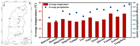 The geographical coordinates (A), average temperature, and average precipitation (B) of 12 production areas.