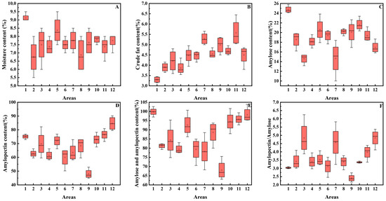 Nutrient components moisture content (A), crude fat content (B), amylose content (C), amylopectin content (D), amylose and amylopectin content (E), and amylopectin/amylose (F) of foxtail millet in 12 production areas. The twelve production areas were numbered as Hunyuan (1), Shanyin (2), Dingxiang (3), Xingxian (4), Yangqu (5), Yuci (6), Taigu (7), Xixian (8), Qinxian (9), Yuanqu (10), Zezhou (11), and Yangcheng (12).