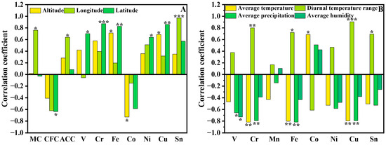 As shown in Supplementary Table S4, the correlation analysis was conducted between 18 nutritional quality traits and 13 ecological parameters. In general, geographical factors and climate factors had a greater impact on the nutritional quality of Jingu 21 than soil factors. We selected quality indicators that are significantly correlated with geographical and climatic factors, performed a correlation analysis, and plotted histograms (Figure 4). The content of Fe and Cu had a significant positive correlation with the altitude (p ≤ 0.05), whereas Co was negatively corrected to the altitude (p ≤ 0.05). The longitude was positively correlated to MC (r = 0.76) and ACC (r = 0.64) while having a negative correlation with the Sn content (r = 0.97). The latitude had a significant effect on the nutritional quality, and we found that it was negatively correlated to CFC (p ≤ 0.05) but positively correlated to V (p ≤ 0.05), Cr (p ≤ 0.001), Fe (p ≤ 0.01), and Cu (p ≤ 0.01) (Figure 4A). The average temperature and diurnal temperature range had opposite effects on foxtail millet nutritional quality, and our results showed that the average temperature positively affected the Co (r = 0.817) content, whereas the diurnal temperature range had a negative effect on Co (r = −0.801). Cr (p ≤ 0.01), Fe (p ≤ 0.01), and Cu (p ≤ 0.05) were negatively correlated with the average temperature, while Cr (p ≤ 0.01), Cu (p ≤ 0.001), and Sn (p ≤ 0.05) had a positive correlation with the diurnal temperature range. In addition, the average precipitation negatively affected the V (p ≤ 0.05), Cr (p ≤ 0.01), Fe (p ≤ 0.01), and Cu (p ≤ 0.01) content (Figure 4B). Average humidity was negatively correlated to V (r = −0.728), and the soil pH was negatively correlated with Mn (r = −0.702), while the available potassium had a negative correlation with Sr (r = −0.636).