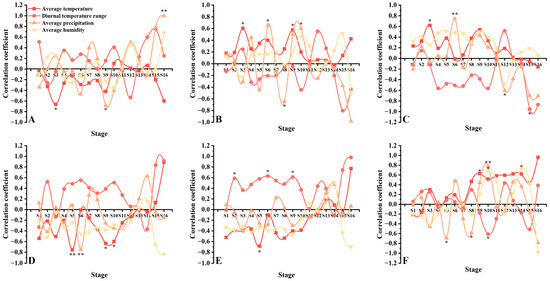Dynamic analysis of climate factors and the key nutrient quality of foxtail millet. The correlation coefficient of climate factors (average temperature, average humidity, diurnal temperature range, and average precipitation) with ACC (A), AP/ACC (B), CFC (C), Fe (D), Cu (E), and Mo (F). * and ** indicate significance at 0.05 and 0.01, respectively. S means every ten days after sowing.