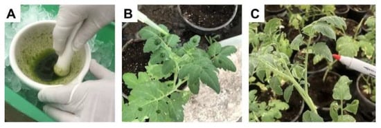Determination of the latency period (LP) from ToBRFV inoculations. (A) Inoculum preparation. (B) Folioles 24 h post-inoculation. (C) Apical folioles selected for analysis by DAS-ELISA.