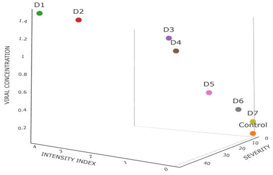Analysis of intensity, severity, and viral load by ELISA in response to ToBRFV infection (Figure 3) showed that the 1 × 10−6 dilution (D7) had significantly lower severity values (0), intensity (0.4), and ELISA (0.21). These results were remarkably like those reported for the control (0, 0, and 0.06, respectively).