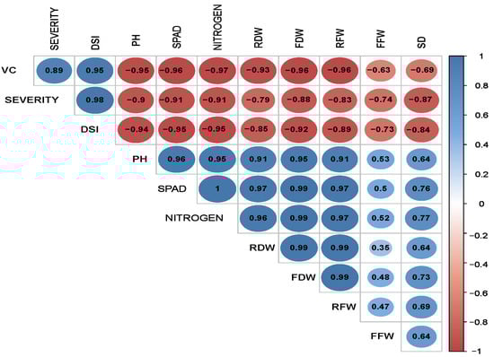 Pearson’s Correlation Analysis evaluates the dilution endpoint and the effect of the variables studied on the treatments performed. Evaluated variables were VC (virus concentration), severity, DSI (disease severity index), PH (plant height), FFW (foliage fresh weight), FDW (foliage dry weight), RFW (root fresh weight), RDW (root dry weight), SPAD (leaf chlorophyll content), and SD (stem diameter).