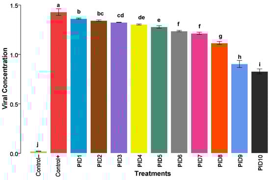 Effect of 1 × 101 (w/v) ToBRFV viral concentration on tomato plants var. 172–300 in greenhouse. Means with different letters indicate statistically significant differences, according to Tukey’s test (0.05). Bars represent the standard deviation from the mean (n = 6). Control− = control without ToBRFV, Control+ = control infected with ToBRFV, PID1 = plant inoculated day 1 after infected control, PID2 = plant inoculated day 2 after infected control, PID3 = plant inoculated day 3 after infected control, PID4 = plant inoculated day 4 after infected control, PID5 = plant inoculated day 5 after infected control, PID6 = plant inoculated day 6 after infected control, PID7 = plant inoculated day 7 after infected control, PID8 = plant inoculated day 8 after infected control, PID9 = plant inoculated day 9 after infected control, and PID10 = plant inoculated day 10 after infected control.