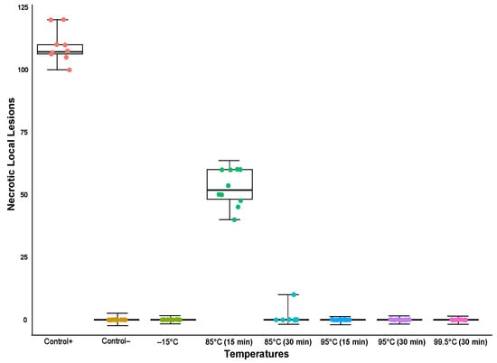 Inoculum is used to determine the thermal inactivation point of ToBRFV with a viral concentration of 1 × 101 (w/v) following [] with modifications. The extracts came from the extraction of one gram of infected tissue, ground in phosphate solution (PBS) (0.01 M, pH 8), and centrifuged at 6000 rpm in Eppendorf tubes. Samples were then exposed to six different temperatures, including −15 °C for 24 h of incubation at 100 rpm in a Mini Dry Bath MDB100C (Joanlab, Huzhou, China). Similarly, they underwent temperatures of 85 °C (for 15 and 30 min), 95 °C (for 15 and 30 min), and 99.5 °C (for 30 min) at 100 rpm. An IncumixTM Incubator Shaker (Daeil Tech, Gangnam, Republic of Korea) incubated all samples. An amount of 100 µL of the prepared sap was taken for each treatment and inoculated into half leaves of N. longiflora corresponding to each treatment. There were 20 replicates per treatment and readings at eight dpi were carried out by counting the number of necrotic local lesions (NLL) produced []. An ANOVA test and a means comparison using Tukey’s multiple range test (p = 0.05) were performed.