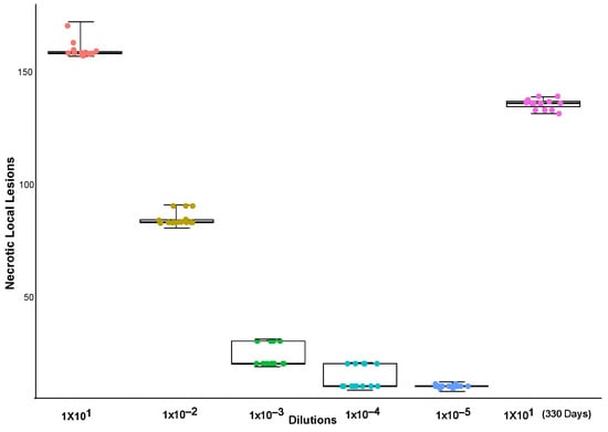 The persistence of infective sap with ToBRFV preserved for 330 days, evaluated on N. longiflora plants, resulted in dilutions that reduced the number of local necrotic lesions (NLL) to 1 × 10−4 (13.33) and 1 × 10−5 (10), compared to dilution of 1 × 101 (158.97), demonstrating the survival of infectious viral particles, even while remaining dormant (Figure 7). Furthermore, ToBRFV-infected tissue stored for 330 days is capable of harboring viral particles even without being in liquid media, which acquired an amount of NLL formed in N. longiflora leaves (135.33), almost equivalent to that reported with the 1 × 101 dilution.