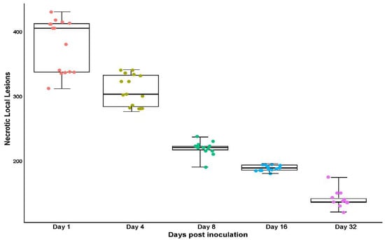 The second phase of the experiment started 15 dat; a crude sap solution from plants infected with the FQ3-ToBRFV isolate, diluted to a concentration of 1 × 101 (w/v) in sterile distilled water, was prepared []. Since no information was available on the stability of ToBRFV in sap, we established intervals in a geometric progression of 1, 4, 8, 16, and 32 days. For the execution of the trial, five treatments for the first day, D1, D4 for the fourth day, D8 for the eighth day, D16 for the sixteenth day, and D32 for the thirty-second day each were designated. For each treatment, we performed 20 replicates, using half-detached leaves of N. longiflora as the replicate unit. The inoculation process was to apply 100 µL of the solution to the detached half-leaf, followed by complete dispersion using a bacterial dipper [] and counting of LLN 10 dpi. The counting and analysis of the NLL were conducted using an ANOVA, and means were compared via Tukey’s mean test (p = 0.05) using the statistical software SAS version 9.1.