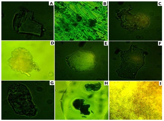 Tobamoviruses have the peculiarity of inducing physicochemical alterations in cells of infected tissue after infection with their host. The most prominent inclusions were those stained with Methyl Green in S. lycopersicum and N. tabacum tissue (Figure 9A–D). In S. lycopersicum, inclusions reported within the parenchymal palisade were rounded and stacked plaques (Figure 9A) with a size of 44.89 μm long and 30.80 μm wide, an association of X-bodies in a mass of aggregates with uniform sizes (Figure 9B) of 18.32–73.91 μm long and 18.32–28.32 μm wide, and the inclusion of X-bodies with the following dimensions: width 37.88 μm and length 54.05 μm (Figure 9C,D). In N. tabacum, in the upper epidermis, X-bodies in a mass of aggregates (Figure 9E–G) with sizes ranging from 46.45–61.98 μm wide to 48.55–102.02 μm were found, as were inclusions inside a plant cell with a size of 31.14–37.55 μm (width) and 55.31–82.01 μm long (Figure 9H). When the pericarp of severely symptomatic fruits could be visualized, chromoplasts (Figure 9I) with a diameter of 8.95 to 10.76 μm were found, with spots in the center of the epidermal.