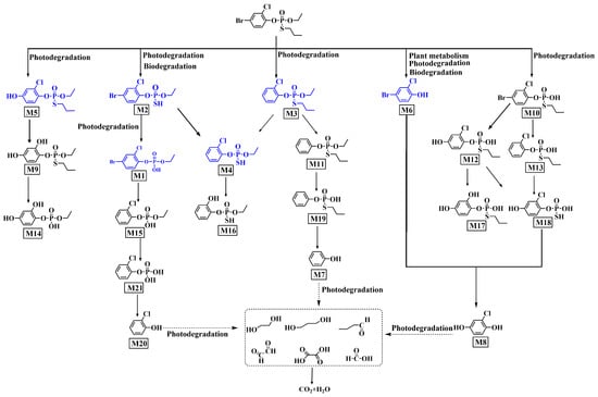 Proposed photodegradation pathway of profenofos in water. Note: Blues are identified compounds. Blacks are conjectured compounds.