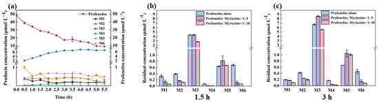Concentrations of M1–M6 during profenofos photolysis (a). Concentrations of M1–M6 with 5 ratio molar of myricetin under 1.5 h HPML irradiation (b) and under 3 h HPML irradiation (c). Note: (1) Light intensity: high-performance liquid chromatography (HPML), 8.1 × 105−9.9 × 105 lx, 25 ± 1 °C. (2) The profenofos concentration was 50 μmol·L−1. (3) The error bars represent standard deviations (variables = 3). (4) M1 is O-(4-Bromo-2-chlorophenyl)-O-ethyl phosphate, M2 is O-(4-bromo-2-chlorophenyl)-O-ethyl-S-hydroxy phosphorothioate, M3 is O-(2-chlorophenyl)-O-ethyl-S-propyl phosphorothioate, M4 is O-(2-chlorophenyl)-O-ethyl-S-hydrogen phosphorothioate, M5 is O-(2-chloro-4-hydroxyphenyl)-O-ethyl-S-propyl phosphorothioate, and M6 is 4-bromo-2-chlorophenol.