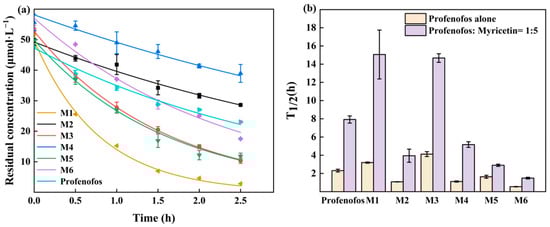 M1–M6 and profenofos concentrations are shown with and without myricetin under 1.5 and 3 h HPML irradiation (Figure 2b,c). After 1.5 h and 3 h irradiation, M3 concentration did not show an obvious difference with and without 5 molar ratios of myricetin. In the photolysis mixture of profenofos with 5 molar ratios of myricetin, M3 and M5 generated more than that without myricetin after 3 h irradiation. In the photolysis mixture of profenofos solution with 10 molar ratios of myricetin, the generation of M3 was decreased, while that of M5 was slightly changed. It indicated that a higher concentration of myricetin decreased the generation of M3. The degradation kinetics of M1–M6 are shown in Figure 3a. The k values of M1–M6 were 0.22, 0.64, 0.17, 0.62, 0.43, and 1.27 h−1, while the k values of profenofos was 0.30 h−1. M2, M4, M5, and M6 degraded faster than profenofos, while M1 and M3 degraded slower than profenofos. Figure 3b shows the T1/2 of M1–M6 with 5 molar ratios of myricetin and without myricetin under HPML irradiation. In the presence of myricetin, the T1/2 of M1–M6 were 3.19, 1.08, 4.12, 1.11, 1.63, and 0.55 h. The photodegradation rates of M1 and M3 decreased by about 5 times, and M2 and M4 decreased by 2.5 times, while M5 and M6 decreased 1 time in the presence of 5 molar myricetin. Myricetin also had a different ability to inhibit the photoproducts of profenofos.