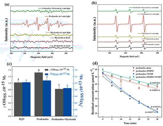 Electron spin resonance (ESR) is a spectroscopic technique which can detect free radicals. The spin trap can form stable adducts with ROS and then produce specific ESR signals. This ability was used to determine the type of radicals produced in photochemical reactions. Figure 4a shows that no ESR signals occurred after the addition of DMPO to profenofos and myricetin solutions in the dark. After 1 min of illumination, myricetin did not show ESR signals, while profenofos had a 1:2:2:1 DMPO-OH specific signal. This indicated that the profenofos solution produced •OH under light. Similarly, a TEMP-1O2 (1:1:1) signal was found after 1 min of illumination (Figure 4b), indicating that •OH and 1O2 were generated during profenofos photodegradation. These two specific signals disappeared after the addition of myricetin, suggesting that myricetin could scavenge the production of •OH and 1O2, thus reducing the photodegradation rate of profenofos [40].