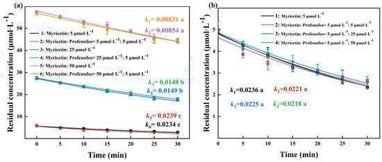 To further demonstrate the role of myricetin in the profenofos photodegradation, the concentration of myricetin in the profenofos–myricetin solutions under HPML was analyzed (Figure 5). The degradation rates of myricetin were 0.0234 and 0.0239 min−1 for 5 μmol·L−1 myricetin with and without 5 μmol·L−1 profenofos. The degradation rates of myricetin were 0.0149 and 0.0148 min−1 for 25 μmol·L−1 myricetin with and without 5 μmol·L−1 profenofos, and the degradation rates of myricetin were 0.00854 and 0.00831 min−1 for 50 μmol·L−1 myricetin with and without 5 μmol·L−1 profenofos, respectively (Figure 5a). Figure 5b shows that the degradation rate of 5 μmol·L−1 myricetin was 0.0236, 0.0221, 0.0225, and 0.0218 min−1 without profenofos or with 5, 25, and 50 μmol·L−1 profenofos, respectively. There is no obvious difference between the degradation of myricetin alone and myricetin with different concentrations of profenofos. Profenofos had no effect on myricetin degradation. The photodegradation of profenofos was the photooxidation reaction between the excited state of profenofos and the free radicals in water under the action of photons, and with myricetin as a free radical scavenger, it could scavenge the free radicals in water. It suggested that myricetin was indirectly slowing down the photolysis rate of profenofos by scavenged reactive species. Regarding other pesticides (such as methyl parathion, malathion, cyhalofop-butyl, and imidacloprid), myricetin also had an inhibitory effect on their photodegradation (Table S6).