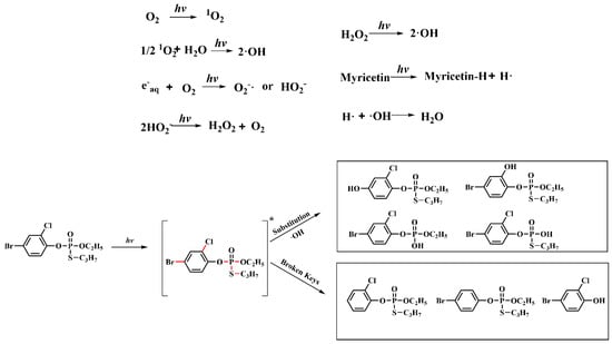 Based on the profenofos photolysis pathway, the inhibition mechanism of myricetin on the profenofos photodegradation could be concluded as follows. (1) Dissolved oxygen produced •OH and 1O2 under the light irradiation, because in the presence of dissolved oxygen, •OH and 1O2 could be produced by water molecules [45,46]. (2) Both 1O2 and •OH were reactive oxygen species required for profenofos photodegradation, and •OH had the more significant effects. (3) As a free radical scavenger, myricetin provided protons and electrons to react with reactive oxygen species in water. Thus, myricetin inhibited the photolysis of profenofos. However, myricetin was not directly involved in the photolytic reaction of profenofos, as shown in Figure 6.