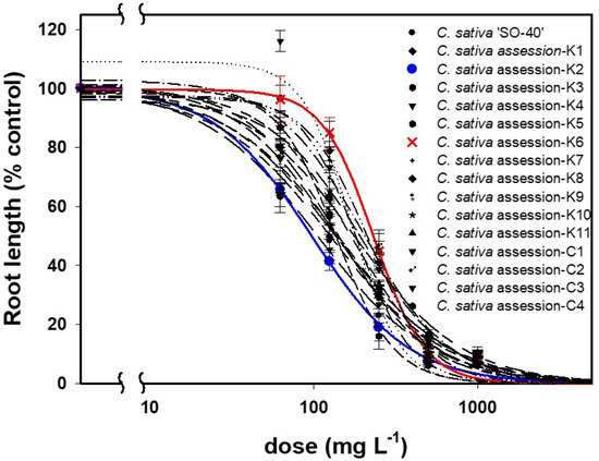 Dose–responses of seedling root length for the tested sixteen camelina genotypes to a range of Al concentrations (0–1000 mg L−1) in the Petri dish study. The red and blue solid lines represent the most Al3+-resistant (CamK6, GR50 = 232.0 mg L−1) and -sensitive (CamK2, GR50 = 97.0 mg L−1) camelina genotypes determined based on the GR50 values estimated from the model (Equation (1)) and parameter estimates in Table 3, respectively.
