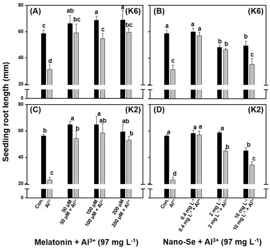 The effects of various treatments on the seedling root length of CamK6 (A,B) and CamK2 (C,D) under Al3+-induced (97.0 mg L−1) seedling growth inhibition. Con.: untreated control; Al3+: 97.0 mg L−1; 50, 100, or 200 μM + Al3+: 50, 100, or 200 μM melatonin co-applied following 97.0 mg L−1 of Al3+ treatment; 0.4, 2, or 10 mg L−1 + Al3+: 0.4, 2, or 10 mg L−1 nano-Se co-applied following 97.0 mg L−1 of Al3+ treatment. Values are the means (n = 3), and bars denote the standard error of the mean. Different letters represent the significant different values determined by Fisher’s LSD test (p ≤ 0.05).