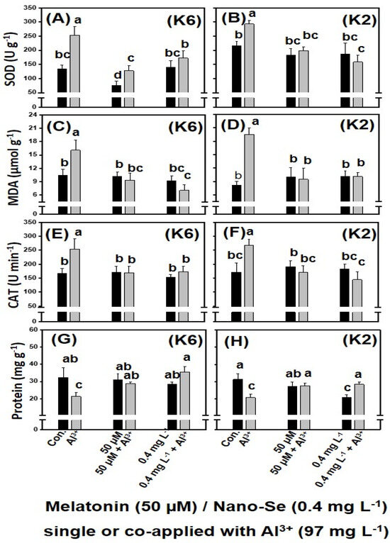 The effects of various treatments on SOD (U g−1) (A,B), MDA (µmol g−1) (C,D), CAT (E,F), and soluble protein (mg g−1) (G,H) of CamK6 (A,C,E,G) and CamK2 (B,D,F,H) under Al3+-induced (97.0 mg L−1) plant growth inhibition at the whole-plant level. Con.: untreated control; Al3+: 97.0 mg L−1; 50 μM + Al3+: 50 μM melatonin co-applied following the root application of 97.0 mg L−1 Al3+ concentration; 0.4 mg L−1 + Al3+: 0.4 mg L−1 nano-Se co-applied following the root application of a 97.0 mg L−1 Al3+ concentration. Values are the means (n = 3), and bars denote the standard error of the mean. Different letters represent the significant different values determined by Fisher’s LSD test (p ≤ 0.05).
