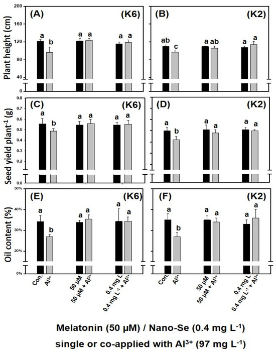 In the case of plant height, the co-application of melatonin or nano-Se at the current dose could effectively alleviate the Al3+-induced stress in the two camelina genotypes, significantly promoting the plants’ growth (Figure 4A,B). For example, in CamK6, the mean plant height under the Al3+-induced stress was 96.4 cm. When melatonin or nano-Se was co-applied, the mean plant height increased to a height (melatonin treatment: 123.6 cm; nano-Se treatment: 119.2 cm) that was comparable to the untreated control (121.1 cm). The seed yield plant−1 of the two camelina genotypes under the Al3+-induced stress also increased by the exogenous application of those chemicals (Figure 4C,D). As shown in Figure 4, the co-application of either melatonin or nano-Se effectively alleviated the Al3+-induced stress in CamK6 (Figure 4C) and CamK2 (Figure 4D) with a seed yield plant−1 obtained (CamK6: 0.562 and 0.558 g plant−1 for co-applied with melatonin and nano-Se, respectively; CamK2: 0.48 and 0.50 g plant−1 for co-applied with melatonin and nano-Se, respectively) comparable to the untreated controls (0.554 and 0.50 g plant−1 for CamK6 and CamK2, respectively). Regarding the oil content of the two camelina genotypes under those treatments, the single or co-applied melatonin or nano-Se with the Al3+ concentration completely counterbalanced the Al3+-induced stress on plants and increased the oil content (%) to the levels of untreated controls (Figure 4E,F).