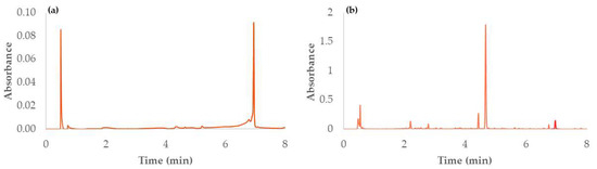 As mentioned in Section 3.1, naringenin was determined according to its chromatogram at 280 nm (Figure 2). The amount of naringenin contained in the extracts was assessed by a chromatographic method, obtaining a mean value of 0.18 ± 0.02 mg naringenin per gram of dry sample.