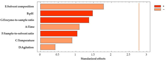 As mentioned in Section 2.3.2, the factors selected for this study were time (X1, expressed in minutes), pH (X2), temperature (X3, expressed in °C), agitation (X4, expressed in revolutions per minute) solvent composition (X5, expressed in terms of ethanol percentage), sample-to-solvent ratio (X6, expressed as grams sample per 15 mL solvent) and enzyme-to-sample ratio (X7, expressed as units of enzyme per gram sample).