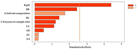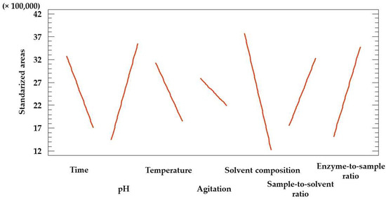 An ANOVA was performed (Table 3) in order to determine the effect of each factor over the standardized areas of naringenin peaks. In the Pareto chart obtained from the statistical analysis (Figure 3), no factor was significant for the extraction yield. However, as only two levels were set for each factor, this design does not study the effect of each factor when intermediate values are considered. Thus, solvent composition (X5), pH (X2) and enzyme-to-sample ratio (X7) were considered for the Box–Behnken design because these factors had the highest effects among all the factors studied. For the rest of the factors, the highest level studied was selected when they showed a positive effect (sample-to-solvent ratio (X6)) and the lowest level was established when their effect was shown to be negative (time (X1), temperature (X3) and agitation (X4)). All this information was extracted from the main effects plot (Figure 4). Therefore, 40 °C, 50 rpm, 0.2 g/15 mL and 10 min were the values chosen for the Box–Behnken design extractions.