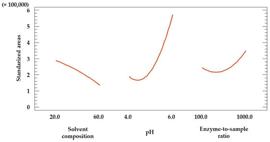 In Figure 6, the optimal values for each of the variables optimized could be determined. Nevertheless, this graph only considers the individual effect for each factor. It does not include the interaction and the quadratic effects, so the real optimal values may differ from the values displayed by this graph. It can be observed that optimal solvent composition corresponds to the solvent with the minimum amount of ethanol (20%) employed for the experimental design, while pH and enzyme-to-sample ratio are optimized at their highest level (pH 6.0 and 1000 U/g).