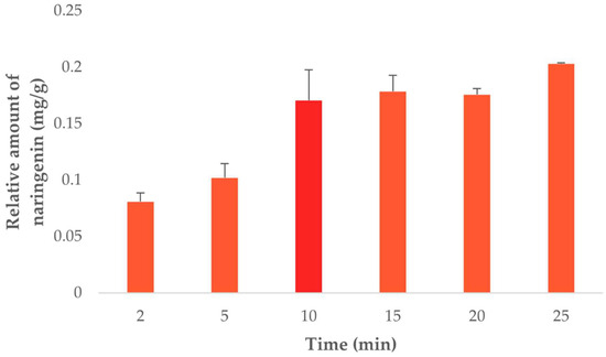 This extraction method is also faster than other methods previously developed as it needs a total processing time of 20 min per sample, compared to the 3 days employed in the method described by Takanaga, H. et al. [36]. Furthermore, even employing higher temperatures (100 °C) and longer extraction times (60 min), other extraction techniques such as Heat Reflux Extraction (HRE) report lower amounts of naringenin in grapefruit extracts [37].