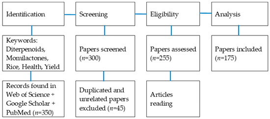 To fulfill the objectives of this research, we conducted a comprehensive literature review focusing specifically on the role of momilactones in the growth, quality, and health of rice, particularly under abiotic and biotic stress conditions. The review process was carried out in four stages (Figure 3) and involved searching databases such as Web of Science, PubMed, and Google Scholar. During the initial identification phase, we used keywords including diterpenoids, momilactones, rice health, rice quality, biotic stress, and abiotic stress. This search yielded 350 articles in March 2023. Out of these, three hundred articles were thoroughly screened. Articles that were either duplicates or not relevant to the study’s focus were excluded. In the end, a total of 255 papers were deemed suitable and were subsequently reviewed for this study.
