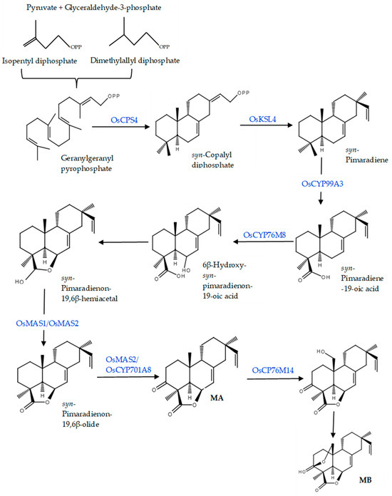 This process involves converting GGDP into syn-copalyl diphosphate (syn-CDP) through the action of CDP synthases (Os-CPS4). Following this, syn-CDP is cyclized into syn-pimaradiene by OsKSL4. The cDNA for OsCPS4 was obtained from rice leaves subjected to UV irradiation. Both OsCPS4 and OsKSL4, which are located close to each other on chromosome 4, have been identified as having a sequential mechanism to produce syn-CDP and syn-pimaradiene [43,44]. Further metabolism of syn-pimaradiene is carried out by cytochrome P450 enzymes (CYPs). OsCYP99A3 oxidizes the C19 methyl group of syn-pimaradiene, resulting in syn-pimaradien-19-oic acid. Subsequently, OsCPY76M8 adds a hydroxyl group at the C6 position to produce 6β-hydroxysyn-pimaradienon-19-oic acid. This is followed by the spontaneous closure of the ring between C19 and C6, forming syn-pimaradienon-19,6β-hemiacet [39]. OsMS1 or OsMS2, also known as momilactone synthase, then converts the C19 hydroxyl group into a ketone, yielding synpimaradienon-19,6β-olide [39]. This is further catalyzed by OsMS2 (or OsCPY701A8) to transform the C3 hydroxyl group into a ketone, leading to the formation of MA [22,24]. MB is synthesized through the spontaneous closure of the hemiacetal ring following the C20 hydroxylation of MA, a reaction conducted by OsCP76M14 [45,46].
