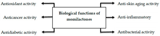 To date, seven momilactone molecules have been identified, namely momilactones A (MA), B (MB), C (MC), D (MD), E (ME), and F (MF) [24,25,26,27,28,29]. Among these, only MA (1), MB (2), and MC (3) as shown in Figure 2 have been definitively identified in rice husks [24,26,27]. In contrast, MD (5) was extracted from rice roots [28]. The compound labeled as ME (6) was initially classified as a momilactone, but this was a misclassification since it does not contain a lactone group in its 19-nor-(9β-H)-pimarane structure. Additionally, two compounds, (3) and (4), have been recognized as MC. However, only compound (3) was derived from rice husks [27]. The other two, compounds (4) (MC) and (7) (MF), were extracted from moss species, specifically Pseudoleskeella papillosa and Hypnum plumaeforme, respectively [29,30].