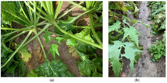 Resprouted Sida plant between the sugar beets on (a) 20 July 2023 and (b) 19 October 2023. All resprouted Sida plants along the entire field were found only in the ruts.