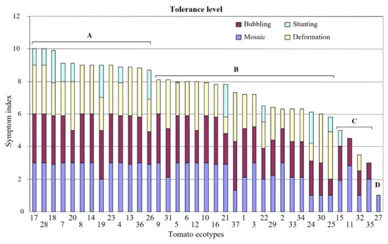 Tolerance levels to ToBRFV of 37 tomato ecotypes, estimated as the inverse of symptom severity index, measured as the addition of the values of four symptoms: leaf mosaic, bubbling, deformation and stunted growth. Average values for ten plants per symptom and ecotype were calculated based on this scale: 0, asymptomatic; 1, mild; 2, medium; and 3, severe for each symptom. The ecotypes were classified into four groups: A, B, C and D, based on statistical analysis and the relevance of differences.