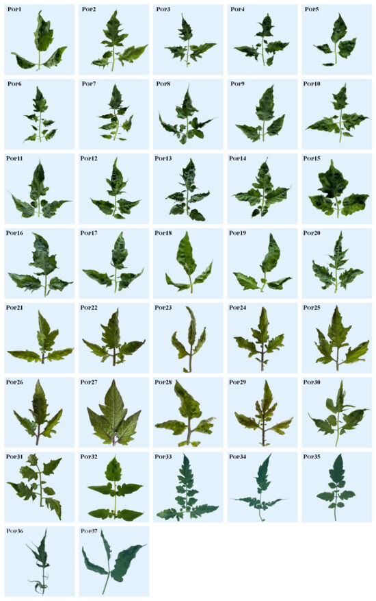 Most of the ecotypes showed indeterminate or semi-determinate plant growth, with a percentage of 45.9% (17 ecotypes) and 40.5% (15 ecotypes), respectively (Supplementary Table S1). Four ecotypes showed determinate plant growth (10.8%), whereas only one showed dwarf plant growth (Pop6) (Supplementary Table S3). Regarding the leaf attitude, three types were observed: horizontal leaf attitude (48.6%), drooping leaves (35.1%) and semi-erect leaves (16.3%). The leaf type did not show a wide range of variation and was mainly of the standard type (22 ecotypes—59.5%), followed by potato leaf type (11 ecotypes—29.7%) and peruvianum type (four ecotypes—10.8%).