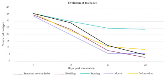 Visual inspection of the symptoms on leaves and stems was performed at 7, 14, 21 and 28 days post-inoculation (dpi). Four symptomatic characters were evaluated: leaf mosaic, leaf bubbling, leaf deformation and stunted growth. Intensity of each symptom had four values: 0, asymptomatic; 1, mild; 2, medium or moderate; and 3, severe. A symptom severity index was estimated by adding the intensity values of the four symptoms, having a range from 0 to 12, which can be considered as an inverse of the tolerance level.