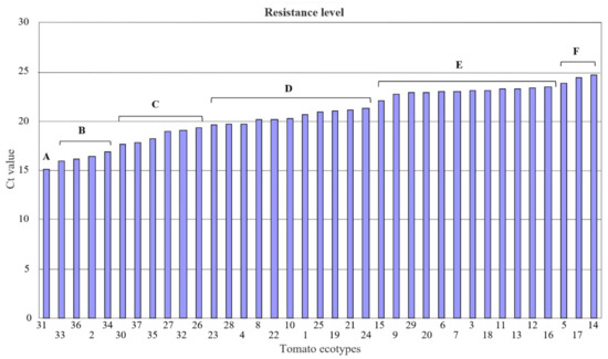 Resistance levels of 37 tomato ecotypes to ToBRFV estimated using Ct values obtained by RT-qPCR, which is inversely proportional to ToBRFV accumulation. The graphic represents the average Ct value calculated from ten plants per ecotype. The ecotypes were classified into six groups: A, B, C, D, E and F, based on statistical analysis and the relevance of differences.