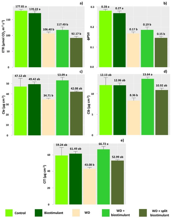Electron transport rate (ETR) (a), quantum efficiency of photosystem II (ϕPSII) (b), chlorophyll-a content (Cla) (c), chlorophyll-b content (Clb) (d), and total chlorophyll content (ClT) (e) of soybean in the water stress reduction tests that applied algae extract-based biostimulant. Means followed by different letters are significantly different according to Tukey’s test at 5% probability, and error bars represent the standard error of the mean (SE).