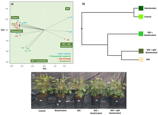 Principal component analysis of water relations, photosynthetic pigment concentrations, gas exchange, and chlorophyll-a fluorescence (a), cluster analysis (b), and visual characteristics (c) of soybean in the water stress reduction test through the application of algae extract-based biostimulant. Ψw = water potential, Ψs = osmotic potential, RWC = relative water content, Pro = proline content, MDA = malondialdehyde, A = net photosynthetic rate, E = transpiration rate, A/E = water use efficiency, Gs = stomatal conductance, Ci = substomatal CO2 concentration, Ci/Ca = ratio of internal to external concentration of CO2, A/Ci = carboxylation efficiency, ETR = electron transport rate, ϕPSII = quantum efficiency of photosystem II, Cla = chlorophyll-a content, Clb = chlorophyll-b content, and ClT = total chlorophyll content.