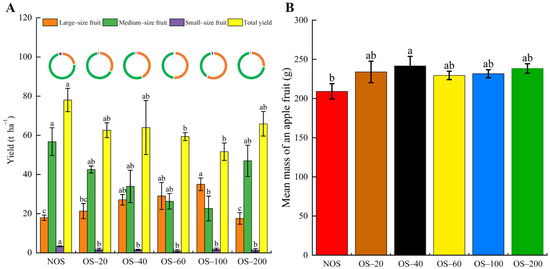 OS also greatly influenced the mean mass of apple fruits. All the mean mass values of apple fruits of the OS treatments were higher than that of the NOS treatment. Notably, the mean mass of apple fruits from the OS-40 treatment (241.5 g) was significantly higher than that of the NOS treatment (Figure 1B).