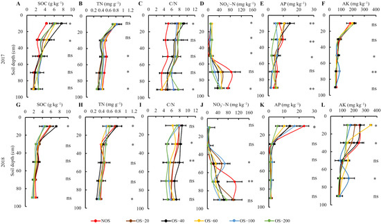 Soil chemical properties were determined in two years after the OS treatments. The results showed that the contents of SOC declined with the increasing soil depth in all the six treatments (Figure 2A,G). In 2017, the SOC content in the upper 40 cm layer of the OS treatments increased significantly compared to that of the NOS treatment (p < 0.05), while no significant difference was identified in the 40–100 cm soil layers among all six treatments. In 2018, the SOC contents in the surface soil (0–20 cm) differed significantly among the six treatments, while no significant difference was observed in other soil layers. The SOC contents in the surface soil of the OS-40 treatment in 2017 and 2018 were both the highest (7.7 g kg−1 and 7.2 g kg−1, respectively). The SOC content in the 0–20 cm layer of all OS treatments increased by 33.5–77.7% in 2017 compared to the NOS treatment. In 2018, however, only the SOC contents in the 0–20 cm layer of the OS-20 and OS-40 treatments were higher than that in the NOS, while the SOC contents in the 0–20 cm layer of OS-60, OS-100 and OS-200 treatments were lower than that of the NOS by 18.1–23.8%.