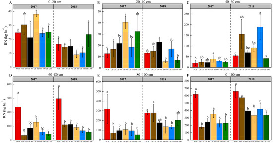 Soil RN contents in 0–20 cm (A), 20–40 cm (B), 40–60 cm (C), 60–80 cm (D), 80–100 cm (E) and 0–100 cm (F) soil layers under different organic substitution treatments in 2017 and 2018. Error bars represent the standard deviation of the mean. Different letters above the bars indicate significant differences at the p < 0.05 level. RN is the residual NO3−-N.