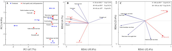 The redundancy analysis (RDA) was conducted to reveal the impacts of soil chemical properties on fruit quality parameters and yield parameters in 2017 (Figure 4B,C). The RDA between the fruit quality parameters and soil chemical properties showed the first two principals of RDA accounted for 99.9% of the total variation in the fruit quality (RDA1 = 95.8%, RDA2 = 4.1%) (Figure 4B). The SOC content in the 0–20 cm soil layer, RN content in the 40–60 cm soil layer, and AP content in 40–60 cm soil layer were identified to be the three main environmental factors that significantly affected the fruit quality parameters (p < 0.05). The SOC content in the 0–20 cm soil layer, positively correlated with the fruit quality parameters (except TA), had the greatest impact on the fruit quality parameters, with an explanation rate of up to 72.8% (Figure 4B).