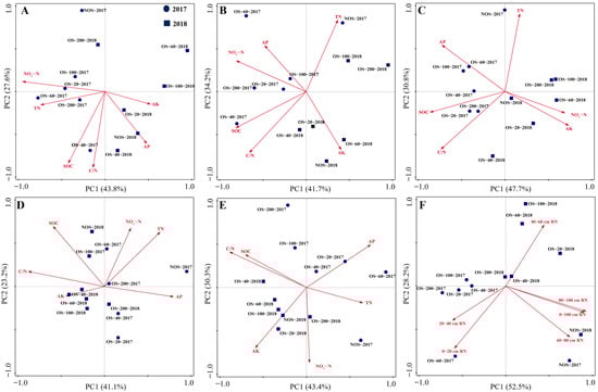 PCA results for soil chemical properties parameters in the 0–20 cm (A), 20–40 cm (B), 40–60 cm (C), 60–80 cm (D), and 80–100 cm (E) soil layers, and the RN content in different soil layers (F) in 2017 and 2018.