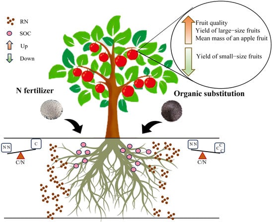 Summary diagram for the effects of organic substitution on the quality of apples, nutrients, and RN leaching in soil. SOC: soil organic carbon. RN: residual NO3−-N. Orange and green arrow represents the increase and decrease in related indexes, respectively.