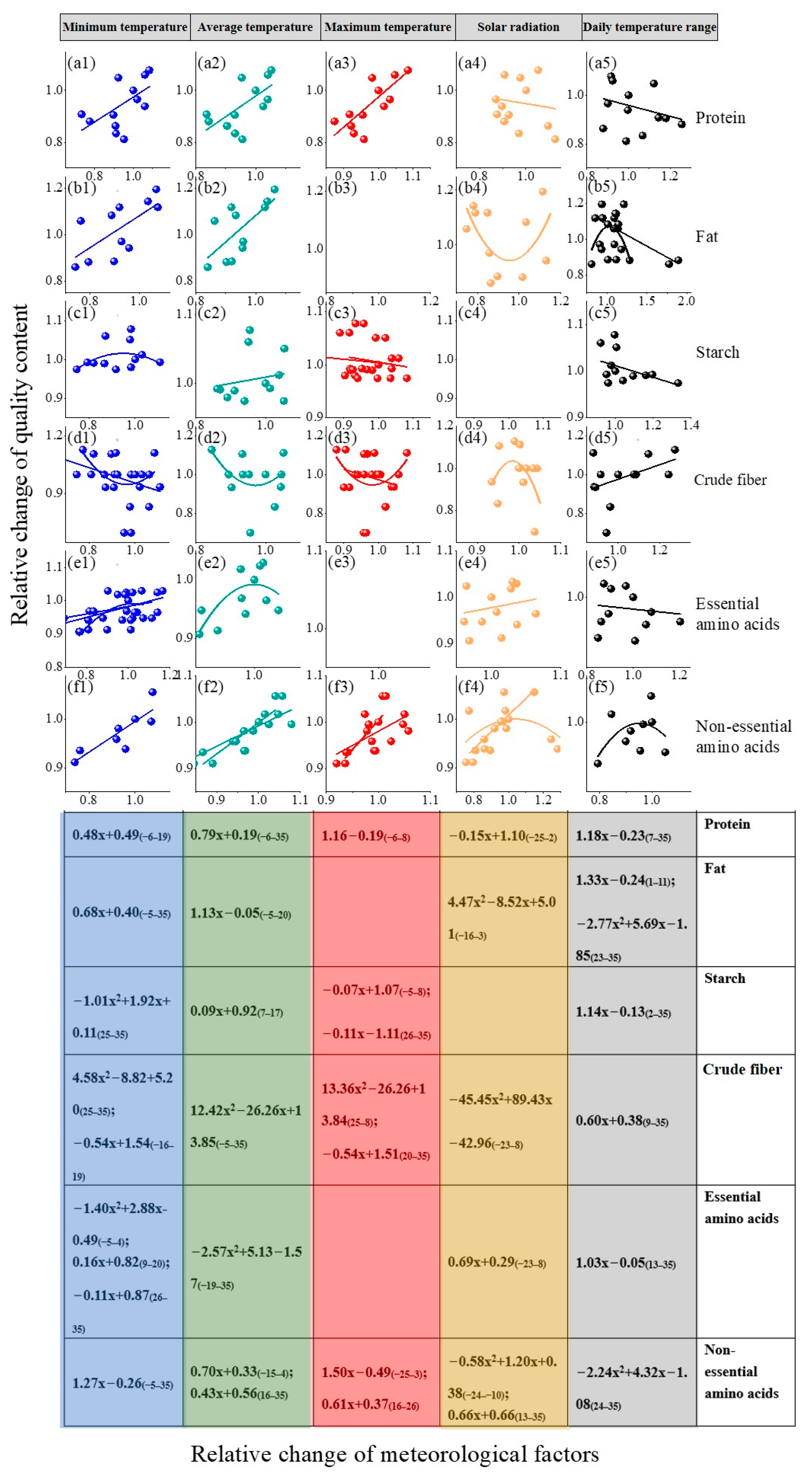 | Nutritional Quality | Minimum Temperature (°C) | Average Temperature (°C) | Maximum Temperature (°C) | Total Solar Radiation (MJ m−2) | Daily Temperature Range (°C) | Constant Term | R2 |