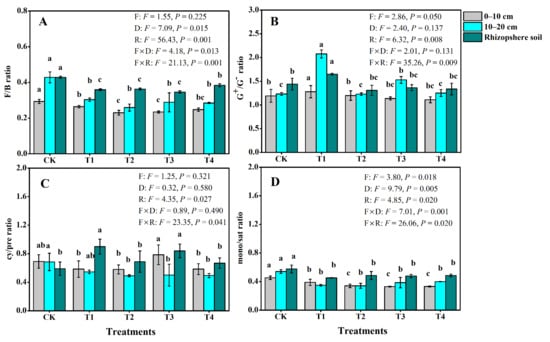 Responses of the ratios of G+ to G− (A), fungi to bacteria (B), cy/pre (C), and mono/sat (D) to long-term fertilization management in the bulk soil of 0–10 cm, 10–20 cm depths, and rhizosphere soil. Different lowercase letters mean significant differences (p < 0.05) among the different treatments within the different soil. The ‘F’, ‘D’ ‘R’, ‘F × D’, and ‘F × D’ indicate the individual and interaction effects of fertilizer and cultivation treatments, soil depths, and rhizosphere (p < 0.05). Abbreviations: G+, Gram-positive; G−, Gram-negative bacteria; cy/pre: the ratio of cyclopropyl to precursor PLFAs; mono/sat, total monounsaturated fatty acids to total saturated fatty acids; CK, blank, no fertilizer applied; T1, a combination of NPK fertilizer plus organic manure and downslope cultivation; T2, NPK fertilizer and downslope cultivation; T3, 1.5-fold NPK fertilizer and downslope cultivation; T4, NPK fertilizer and contour cultivation.
