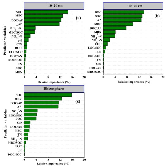 Random forest analysis (RFA) of the relative importance of the soil nutrients and nutrient stoichiometry on total PLFAs for 0–10 cm (a), 10–20 cm depth (b), and rhizosphere soil (c). SOC, soil organic carbon; EOC, exchangeable organic carbon; TN, total nitrogen; AN, available nitrogen; NH4+-N, ammonium–nitrogen; NO3−-N, nitrate–nitrogen; AP, available phosphorus; MBC, microbial biomass carbon; MBN, microbial biomass nitrogen. C/N, the ratio of soil organic carbon to total nitrogen; DOC/SOC: the ratio of dissolved organic carbon to soil organic carbon; EOC/SOC, the ratio of extractable organic carbon to soil organic carbon; MBC/SOC, the ratio of microbial biomass carbon to soil organic carbon; DOC/AN, the ratio of DOC to AN; DOC/AP, the ratio of DOC to AP.