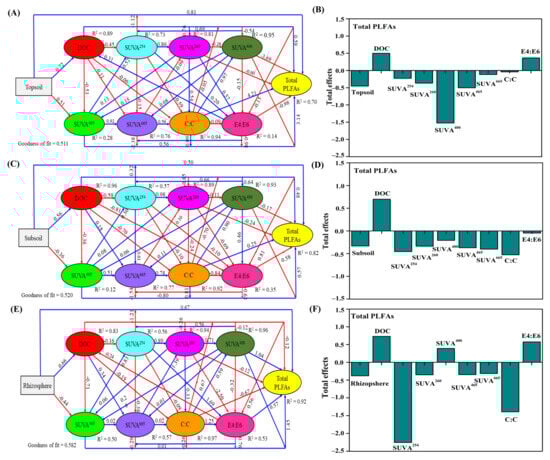 The partial least squares path modeling (PLS-PM) disentangling major pathways of the influences of DOC content and its UV–Vis absorption variables on the total PLFAs for the 0–10 cm (A,B), 10–20 cm depths (C,D) and rhizosphere soil (E,F). The red and blue arrows indicate negative and positive flows of causal relationships (p < 0.05), respectively. The numbers on the arrows represent important normalized path coefficients, and the R2 is the coefficient of determination for each endogenous variable. The goodness of fit (GoF) is calculated as the geometric mean of the average communality and the average R2 value, which assess the overall prediction performance of the model. The total effects are shown as the sum of both direct and indirect effects. PLFA, phospholipid fatty acids; DOC, dissolve organic carbon; Abs254, the absorbance coefficient of 254 nm (m−1); Abs260, the absorbance coefficient of 260 nm (m−1); Abs400, the absorbance coefficient of 400 nm (m−1); Abs465, the absorbance coefficient of 465 nm (m−1); Abs665, the absorbance coefficient of 665 nm (m−1); SUAV254, the ratio of Abs254 to DOC concentration (L mg−1 m−1); SUVA260, the ratio of Abs260 to DOC concentration (L mg−1 m−1); SUVA400, the ratio of Abs400 to DOC concentration (L mg C−1 m−1); SUVA465, the ratio of Abs465 to DOC concentration (L mg C−1 m−1); SUVA665, the ratio of Abs665 to DOC concentration (L mg C−1 m−1); C:C ratio, the ratio of Abs400 to DOC concentration (L mg C −1 m−1); E4:E6 ratio, the ratio of Abs465 to Abs665.