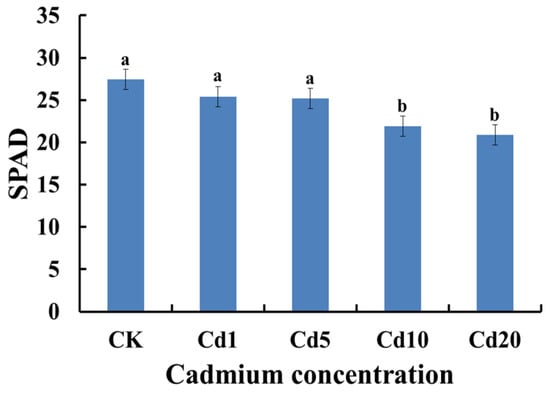 Effects of cadmium stress on the SPAD values of lettuce leaves. Note: Different lowercase letters indicate significant differences at the p < 0.05 level.