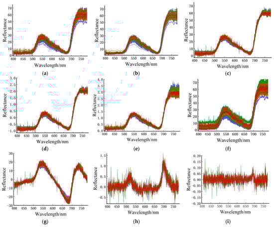 The spectral curves after preprocessing: (a) The original spectral curves; (b) The spectra preprocessed with SG; (c) The spectra preprocessed with MSC; (d) The spectra preprocessed with SNV; (e) The spectra preprocessed with MN; (f) The spectra preprocessed with B; (g) The spectra preprocessed with D; (h) The spectra preprocessed with FD; (i) The spectra preprocessed with SD.