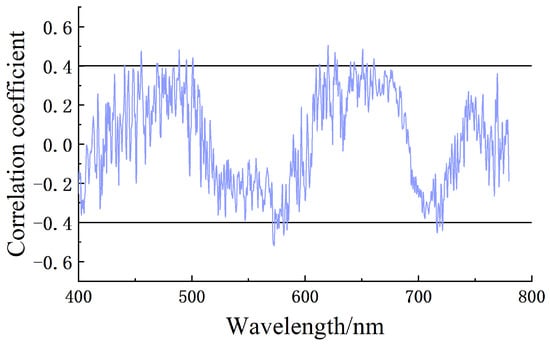 The extraction of feature bands can effectively reduce the dimensionality of data and mitigate the impact of redundant information. In this study, the feature band extraction was conducted using the correlation coefficient method. The determination of feature bands was carried out by calculating the correlation coefficient between the reflectance of each spectral band and the SPAD values of lettuce leaves under cadmium stress. Among them, the larger the absolute value of the correlation coefficient, the more effective information is contained in the reflectance of that spectral band, and thus it is selected as a feature band [22].